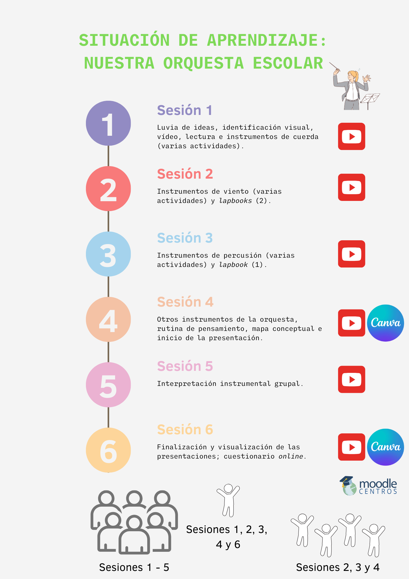 Situación de aprendizaje destinada a alumnado de 5.º de Educación Primaria para la asignatura Música. El centro de interés es la orquesta y durante 6 sesiones trabajamos esta agrupación musical, las tres familias tradicionales de instrumentos, interpretaremos instrumentalmente un fragmento de zarzuela y, como producto final, realizaremos una presentación sobre lo trabajado con la herramienta digital Canva.
