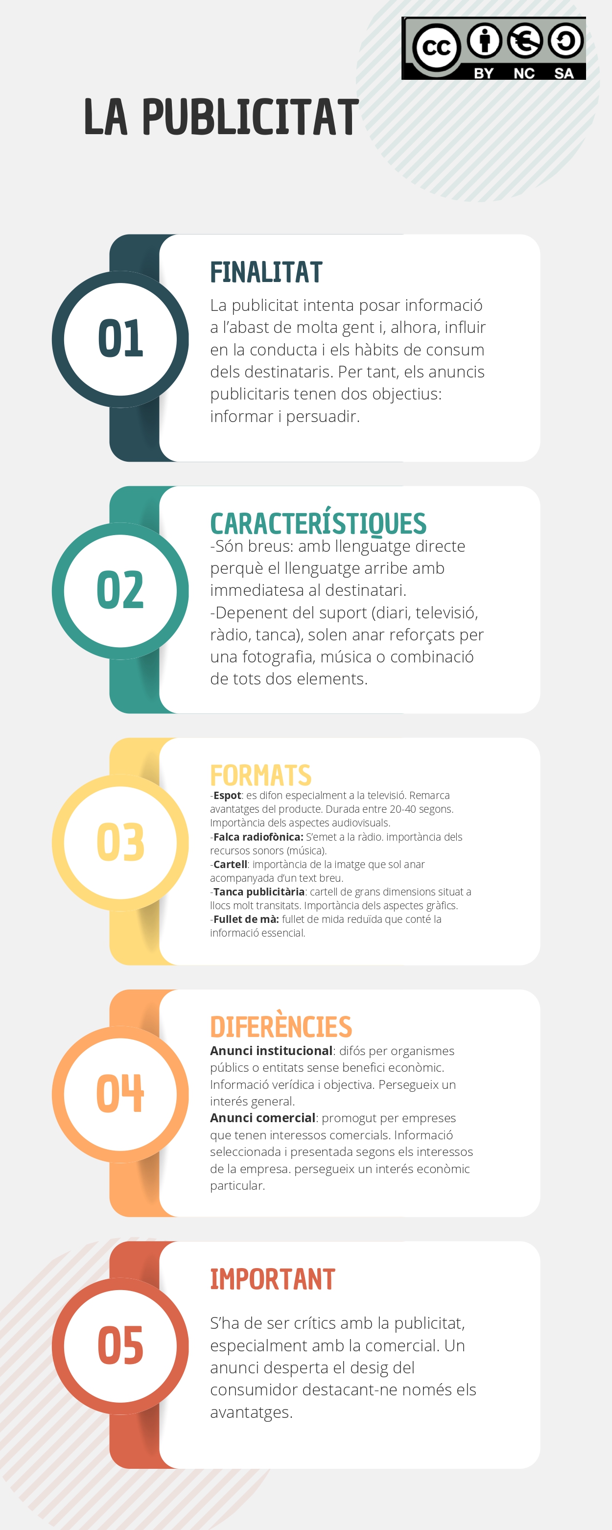 Aquesta infografia explica les característiques pròpies de la publicitat i els diferents tipus de publicitat que podem trobar. Aquest material va adreçat a l'alumnat de 2n de l'ESO amb l’objectiu de poder crear o reconèixer els punts que envolten a la publicitat.