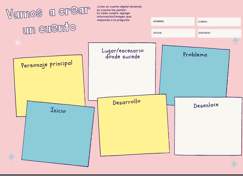 El alumno/os deben crear un cuento teniendo en cuenta las partes de este. En cada cuadro, agregará la información o imagen que responda a cada cuadro.