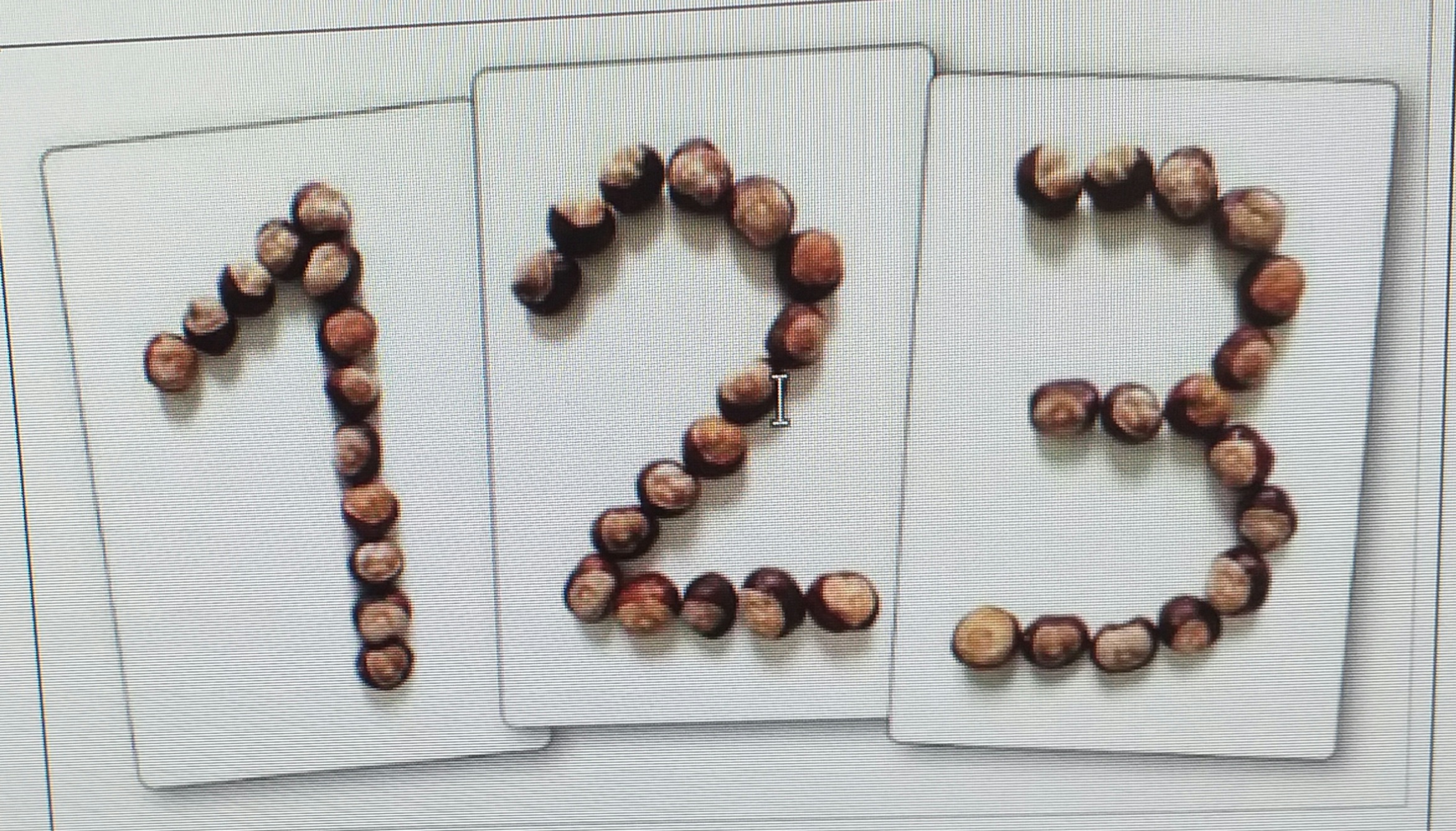 os alumnos construirán los primeros cinco números con los frutos del Otoño, castañas con modelo. Repasaremos la numeración que ya el curso anterior trabajaron en 3 años. Después escribiremos en fichas plastificadas los números con la utilización de rotuladores. Otro concepto sera relacionar numero y cantidad. Y por último contaremos los números hacia delante y hacia atrás.