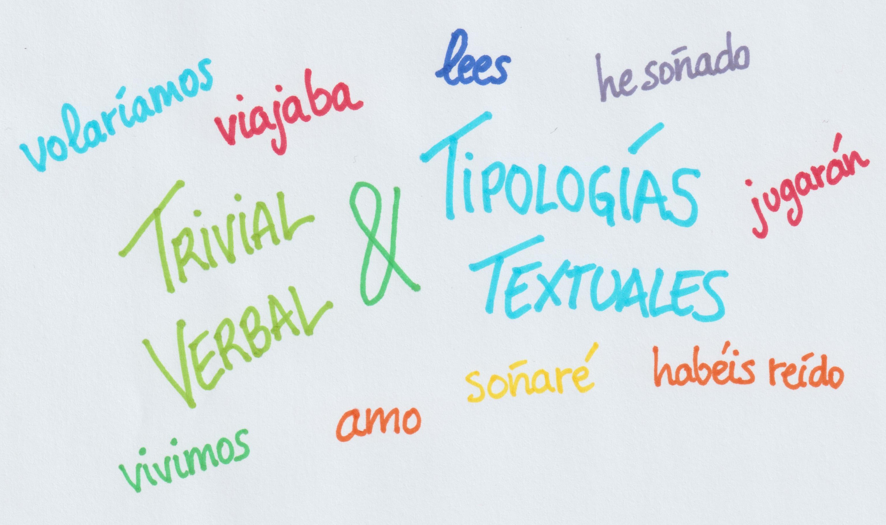 • Trivial verbal; los tiempos verbales y sus usos en las tipologías textuales. • La actividad consiste en que el alumnado conozca y aprenda los tiempos verbales en español para mejorar su expresión, tanto oral como escrita. Para ello, además de realizar actividades en clase, consultar los materiales elaborados por la profesora y acceder a otras fuentes de información, confeccionan las tarjetas para fabricar su propio juego y realizan una pequeña investigación sobre el uso de los tiempos verbales en las distintas tipologías textuales que finalizará con la elaboración de una infografía.