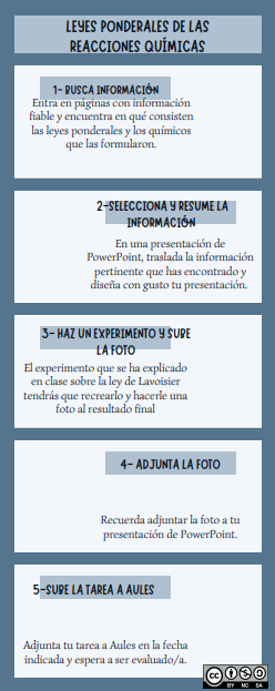 Infografía sobre las leyes ponderales de las reacciones químicas. Diseñado para 2º PDC (4º ESO) en el IES Rafal (Alicante). Dentro de la infografía encontramos los pasos a seguir para realizar una tarea del Ámbito Científico y Tecnológico.