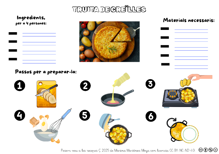 El present recurs és una recepta, en llengua valenciana, on apareixen els passos de manera visual. Va dirigida a l’alumnat de primer de primària. Per implementar-lo cal seguir una seqüència de passos, els quals estan especificats en la infografia que forma part de la primera de les 3 pàgines que conté el format en PDF. Així doncs, s’interpreten els passos visuals per deduir els ingredients i estris (de manera escrita i individual) així com respondre a preguntes comprensives escrites senzilles, amb la tècnica cooperativa “Llapis al centre”. Finalment, s’expressen els passos visualitzats de manera oral (Tècnica 4, 2 i 1 a l’inrevés), emprant connectors d’ordre i amb oracions curtes i clares. Aquests són posteriorment expressats per l’equip cooperatiu, emprant una gravadora d’àudio, amb l’objectiu de fer una posada en comú per rebre feedback.