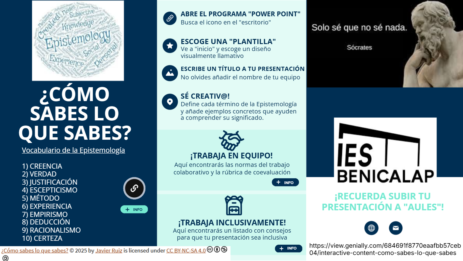 Recurso que contiene una presentación digital mediante la que se ofrecen instrucciones para la realización de una actividad colaborativa orientada a la elaboración de una presentación digital sobre el vocabulario de la Teoría del Conocimiento. Este es un recurso para la materia de Filosofía de 1º de bachillerato que se ajusta al currículum de la Comunitat Valenciana.