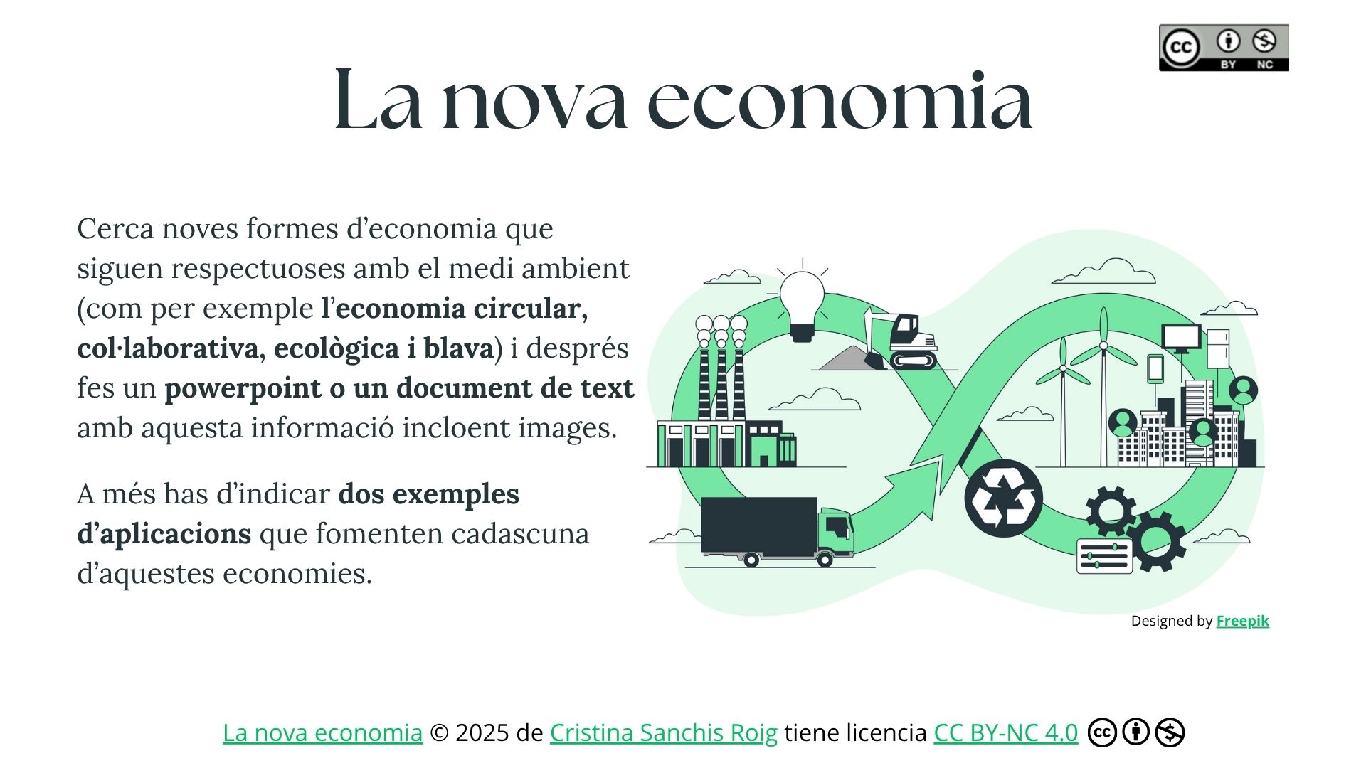 Activitat per a fer en grups. Han de preparar un powerpoint o un word explicant noves formes d'economia més sostenibles amb el mediambient i han d'incorporar 2 aplicacions informàtiques que fomenten l'utilització d'aquestes formes d'economia.