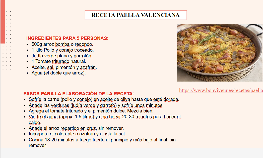 Esta actividad consiste en la elaboración de una receta en formato digital. El alumnado debe realizar una presentación de la receta en power point Microsoft. Esta actividad, es el producto final de una situación de aprendizaje, motivada por el desconocimiento de la dieta mediterránea que muchos y muchas alumnos/as tienen. Ante este problema nos plantemos el siguiente reto: ¿Cómo podemos hacer para que todo el colegio descubra nuevos sabores? Elaboramos una presentación para dar a conocer distintas recetas.