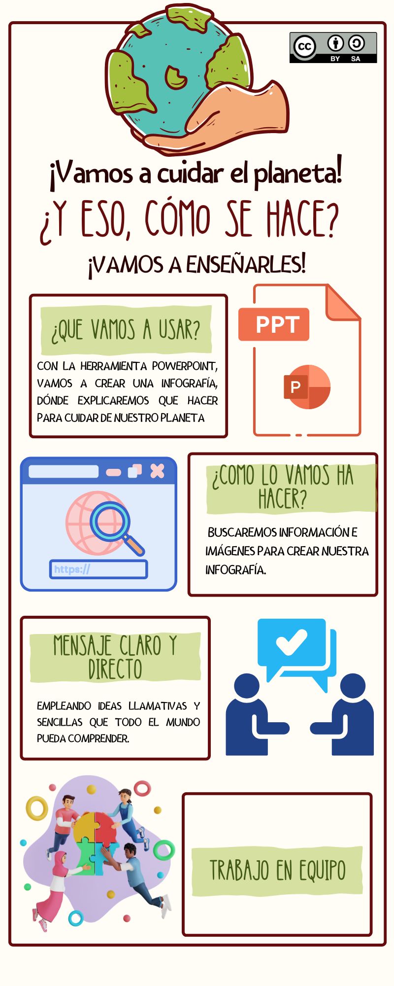 Esta es una infografía explicativa para mi alumnado de 5º de educación primaria. El alumnado, a través del trabajo cooperativo, diseñará un cartel digital en PowerPoint que transmita un mensaje claro y positivo sobre el cuidado del medioambiente. La actividad promueve la búsqueda guiada de información, la selección de imágenes adecuadas y la comunicación eficaz mediante el lenguaje visual y escrito