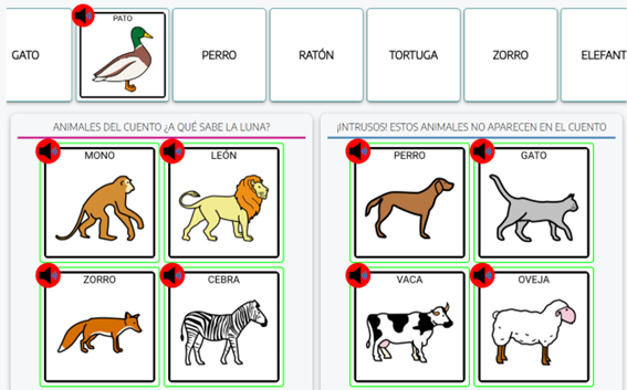 Clasificar los animales en dos categorías: - Animales del cuento ¿A qué sabe la luna? - ¡Intrusos! Estos animales no aparecen en el cuento