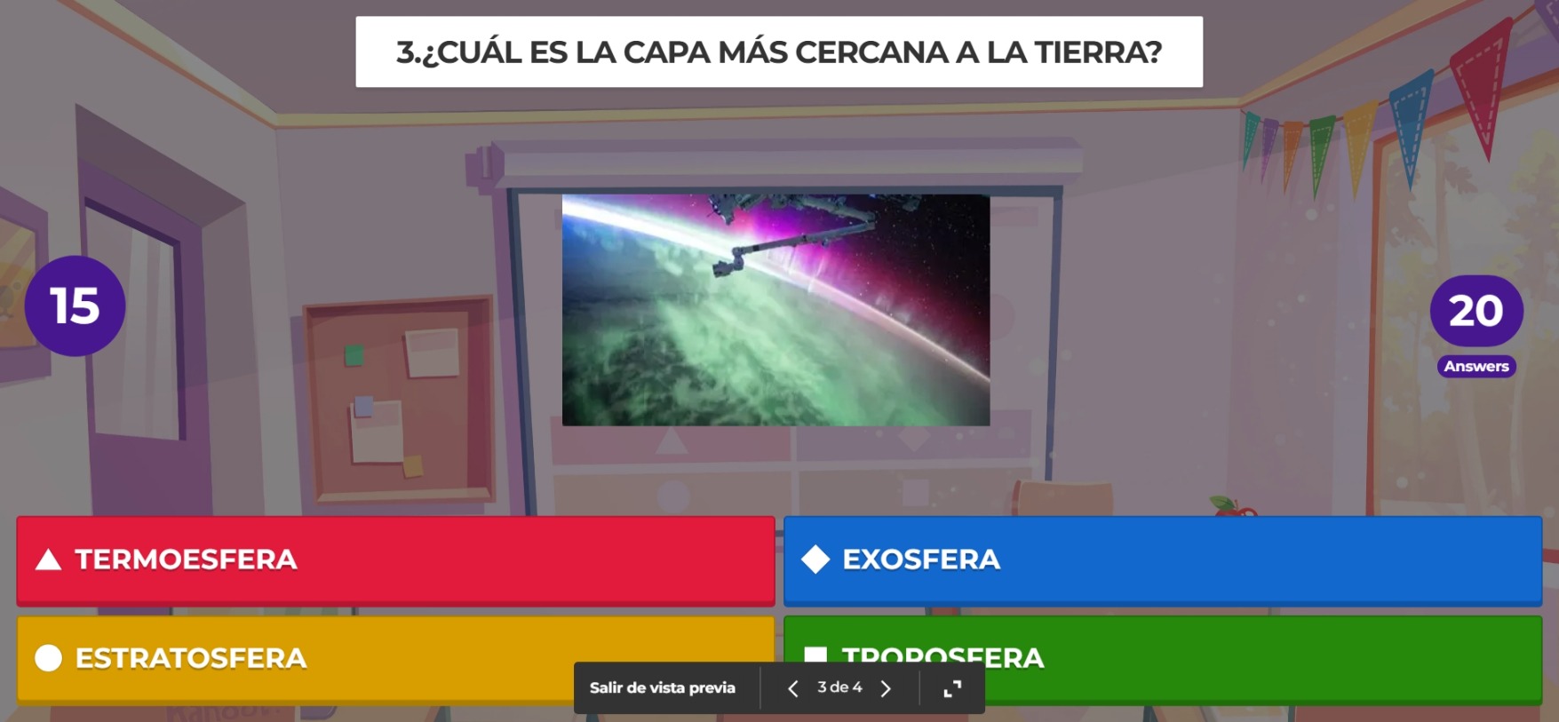 -Título: Jugamos y aprendemos las capas de la atmósfera. - Descripción: Actividad gamificada que se desarrolla tras una sesión explicativa sobre las capas de la atmósfera. El alumnado participará en un juego de preguntas y respuestas a través de la herramienta digital Kahoot para afianzar los conceptos básicos trabajados en clase.