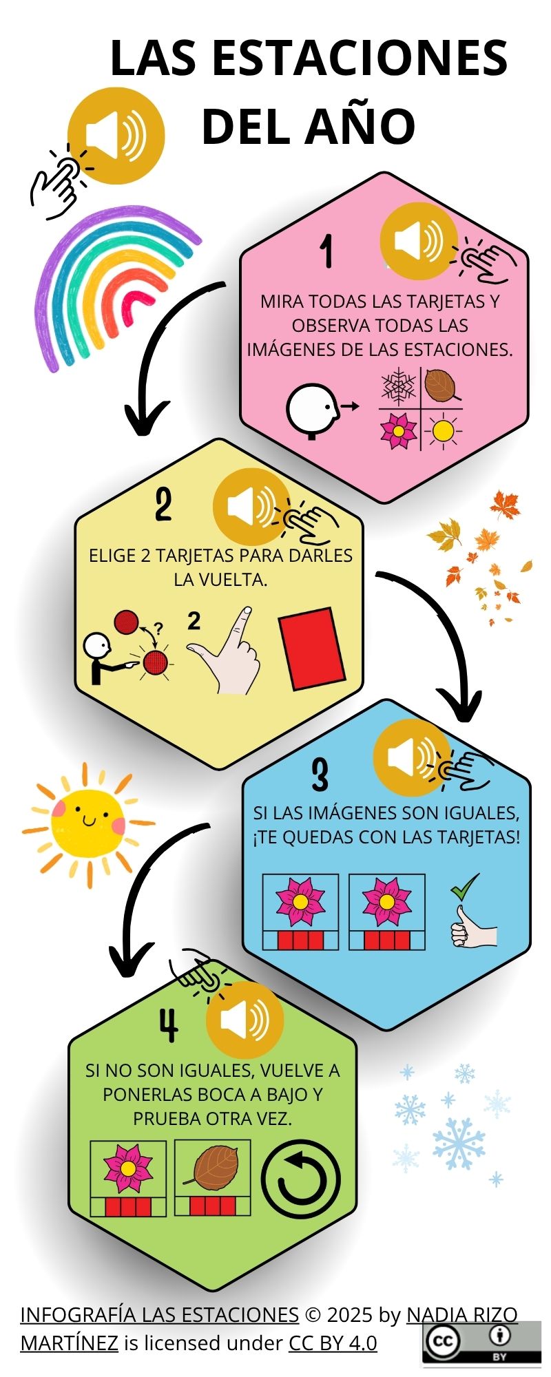 Se trata de una infografía sobre un juego de Memoria tematizado en las estaciones del año. Mediante esta infografía explicamos cómo se lleva a cabo el juego "Memory de Las Estaciones". Puesto que va dirigido, en principio, a alumnado TEA, hemos realizado el recurso tanto en letra, como en pictogramas. Y además, también hemos añadido los audios. De esta manera podemos atender a las diferentes necesidades que presenta cada alumno.