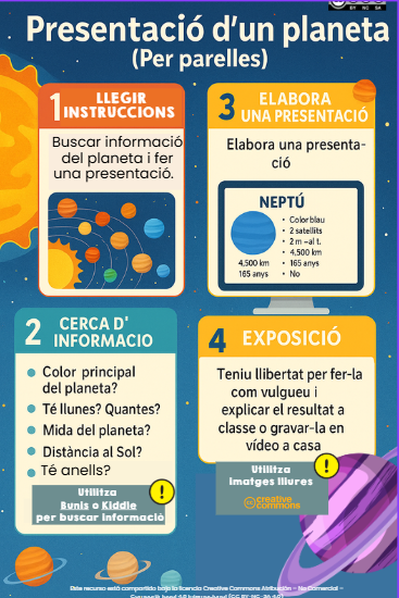 Infografía visual dónde se explica una actividad de investigación sobre los planetas del Sistema Solar para el alumnado de 2º de primaria. Enlace directo a la licencia Creative Commons asignada: https://creativecommons.org/licenses/by-nc-sa/4.0/deed.es