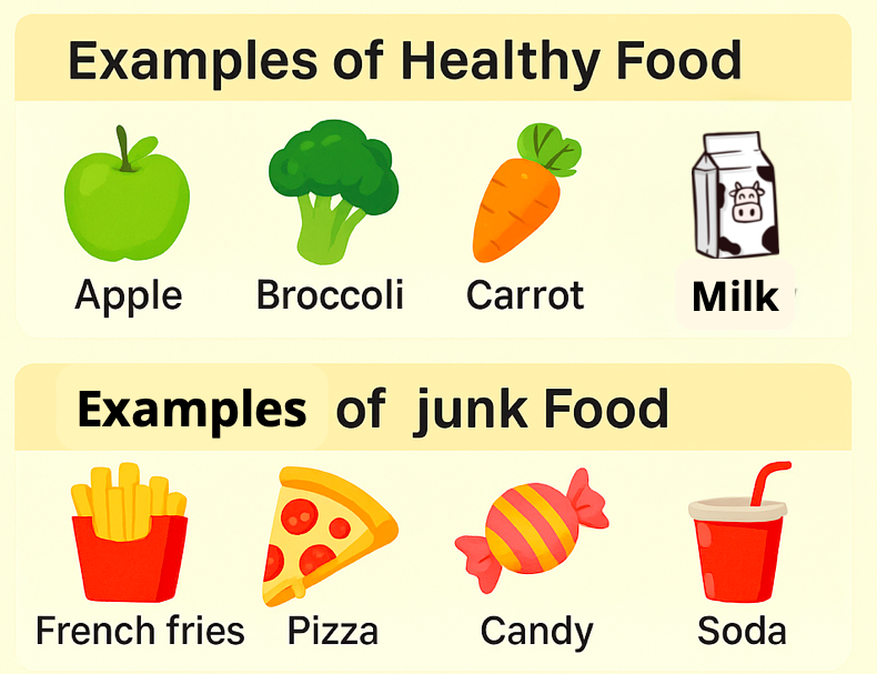 Infografía para ayudar a alumnado de 3.º de primaria a clasificar comida saludable y no saludable, con vocabulario y estructuras en inglés.