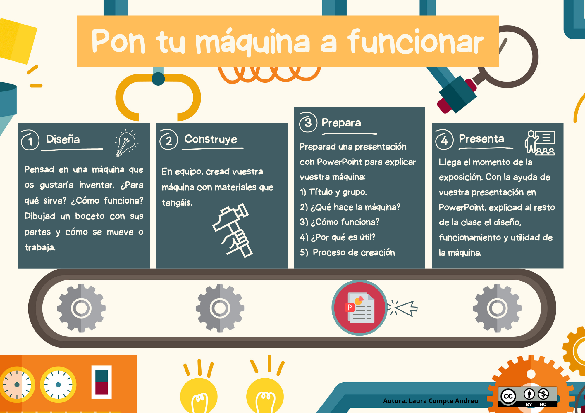 En esta situación de aprendizaje, el alumnado trabajará en pequeño grupo para diseñar y crear una máquina que piensen que podría facilitar el día a día de las personas. Para ello, deberán aplicar los conocimientos adquiridos sobre máquinas simples y tipos de energía que existen. Una vez finalizado el proceso de diseño y creación, cada grupo presentará a los compañeros su máquina y el funcionamiento de la misma, utilizando la herramienta Power Point.
