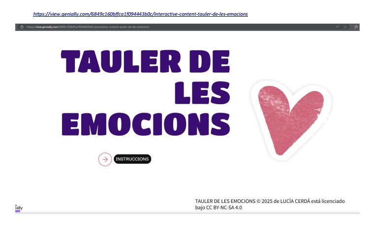 Consisteix en un tauler digital on els infants han d’aconseguir els reptes que planteja cada casella. Aquestes caselles estan relacionades amb les emocions bàsiques. Guanyen quan arriben al final del tauler, aleshores aconsegueixen un premi escollit en anterioritat entre tots/es. Accedeix al recurs ací: https://view.genially.com/6849c160bffca1f094443b0c/interactive-content-tauler-de-les-emocions