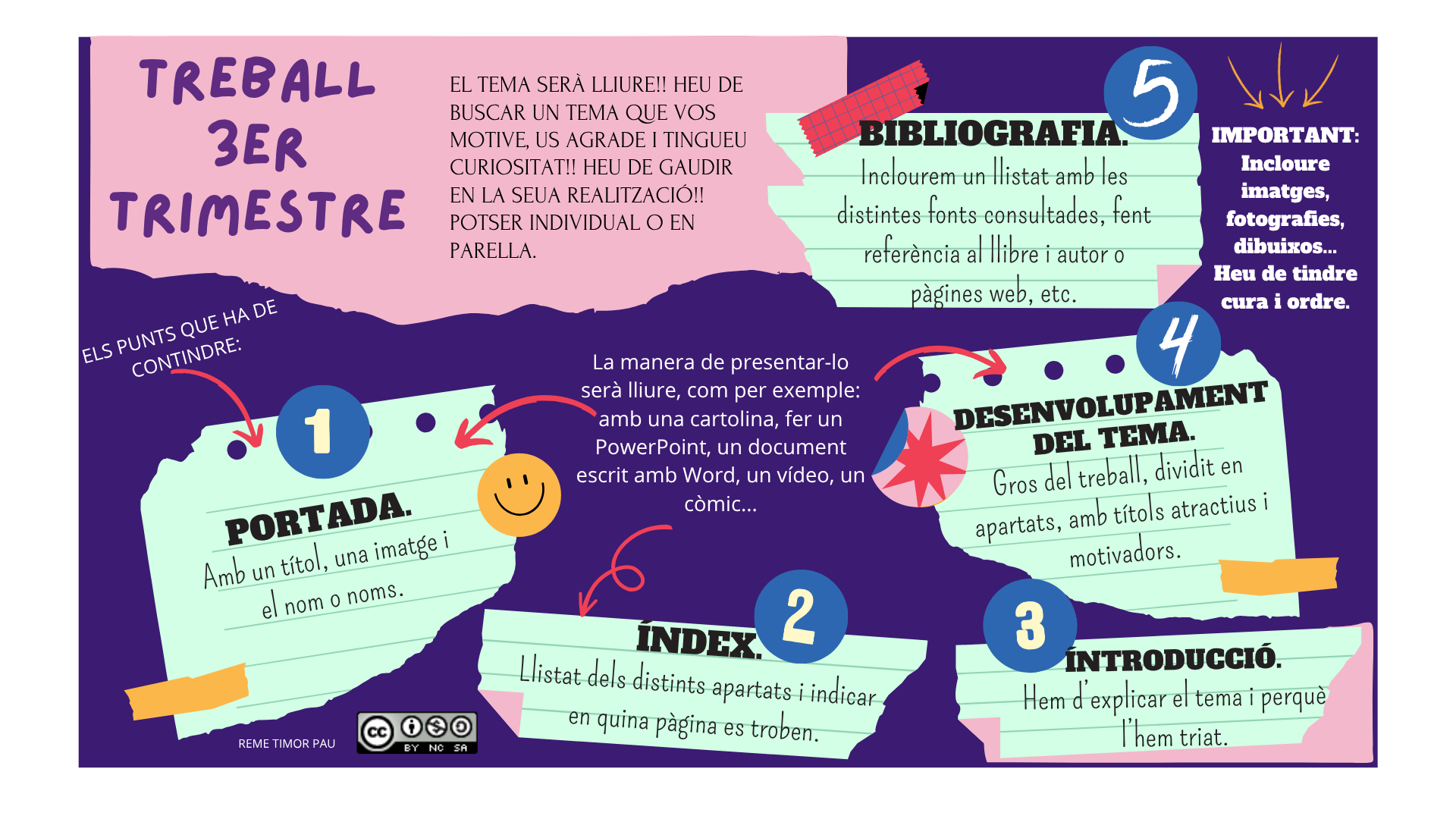 Activitat basada en la realització guiada d’un treball d’investigació sobre un tema lliure triat per l’alumnat amb aprovació prèvia. L’alumnat investiga, redacta i presenta un treball escrit seguint un índex i unes normes de presentación concretes. També es prepara una exposició oral fent ús d’eines digitals com PowerPoint, Canva (opcional) o enregistraments en vídeo.