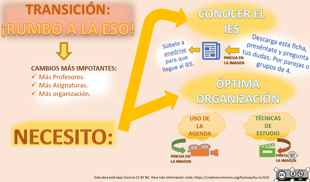 El objetivo de la actividad es acercar al alumnado de 6º de Primaria al Instituto donde estarán matriculados el curso siguiente, que conozcan los cambios más importantes que se van a encontrar y presentarles herramientas con las que van a poder superar dichos cambios. Tendrán que descargar un documento, presentarse y plantear aquellas dudas e inquietudes que tengan acerca del Instituto. También tendrán que visionar dos presentaciones que les permitirán conocer la forma de tener una mayor organización y planificación en sus estudios.