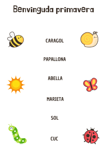 Es tracta d'una activitat lligada a l'inici de la lectoescriptura per infantil 5 anys. En ell podem trobar diferent vocabulari lligat a la primavera, escrit en majúscula. Al voltant de les paraules trobem les diferents imatges d'aquestes.