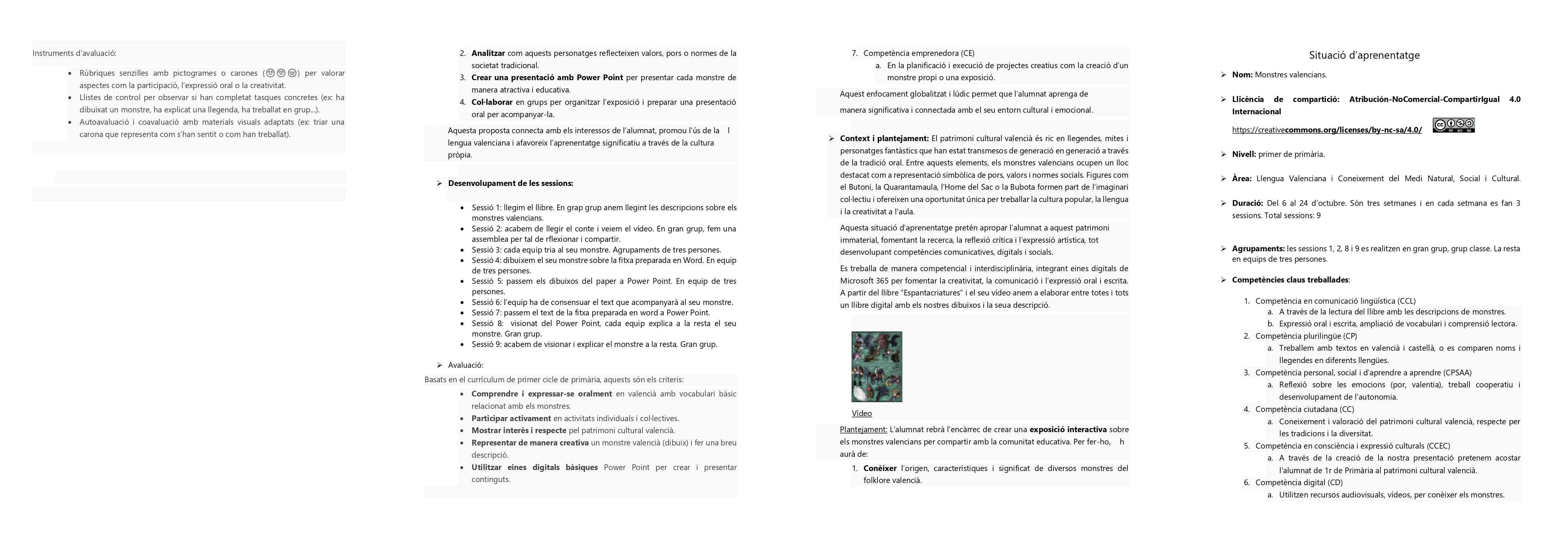 Títol: Monstres valencians El patrimoni cultural valencià és ric en llegendes, mites i personatges fantàstics que han estat transmesos de generació en generació a través de la tradició oral. Entre aquests elements, els monstres valencians ocupen un lloc destacat com a representació simbòlica de pors, valors i normes socials. Figures com el Butoni, la Quarantamaula, l’Home del Sac o la Bubota formen part de l’imaginari col·lectiu i ofereixen una oportunitat única per treballar la cultura popular, la llengua i la creativitat a l’aula. Aquesta situació d’aprenentatge pretén apropar l’alumnat a aquest patrimoni immaterial, fomentant la recerca, la reflexió crítica i l’expressió artística, tot desenvolupant competències comunicatives, digitals i socials. Es treballa de manera competencial i interdisciplinària, integrant eines digitals de Microsoft 365 per fomentar la creativitat, la comunicació i l’expressió oral i escrita. A partir del llibre “Espantacriatures” i el seu vídeo anem a elaborar entre totes i tots un llibre digital amb els nostres dibuixos i la seua descripció.