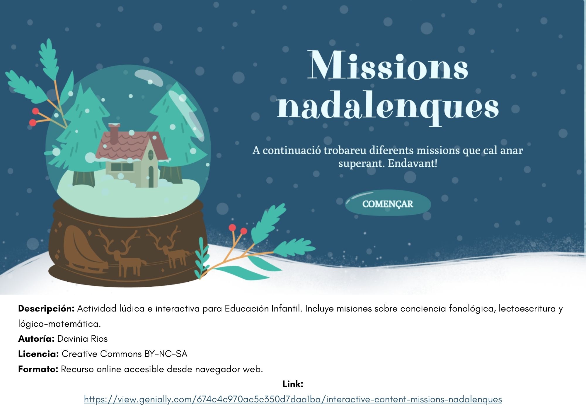 “Missions Nadalenques” és un recurs educatiu interactiu creat amb Genially per a l’alumnat d’Educació Infantil (4 anys). Es tracta d’una presentació gamificada on els xiquets i xiquetes han de superar diferents missions relacionades amb la consciència fonològica, la lectoescriptura i la lògica-matemàtica, dins d’un ambient nadalenc. Es fomenta el treball cooperatiu, la participació activa del grup i l’ús responsable de les eines digitals. És accessible des de qualsevol dispositiu amb connexió a internet.