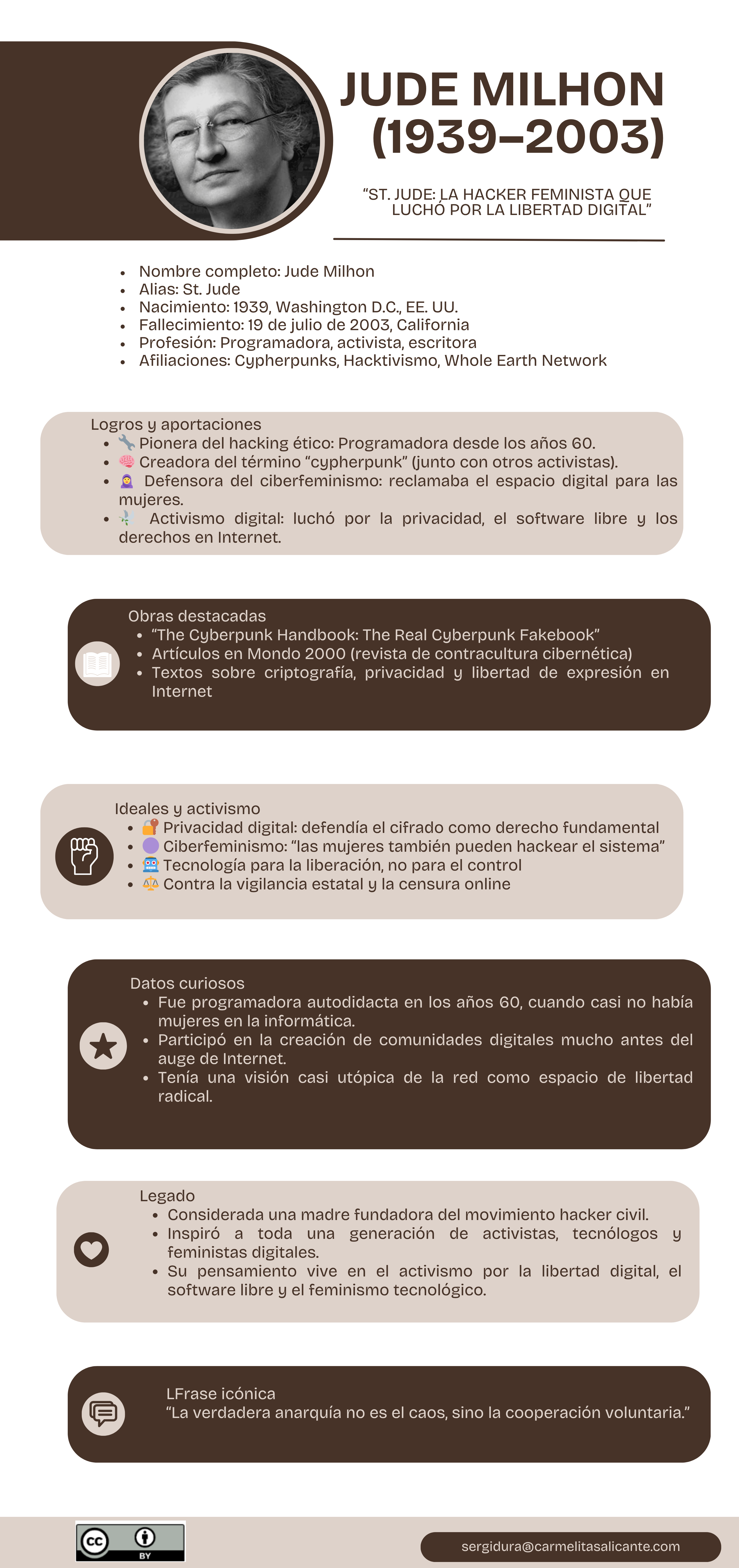 Infografía de Jude Milhon, pionera del hacking ético y del ciberfeminismo, conocida como St. Jude. Con un estilo cyberpunk moderno, muestra su retrato junto a bloques informativos sobre su vida (1939–2003), sus ideas clave —privacidad, libertad digital y feminismo— y su legado como activista tecnológica. Infografía en PDF para presentar a esta mujer a los alumnos de 4º de ESO. A partir de esta infografa deberán buscar información de ella para elaborar un podcast utilizando la herramienta Audacity.