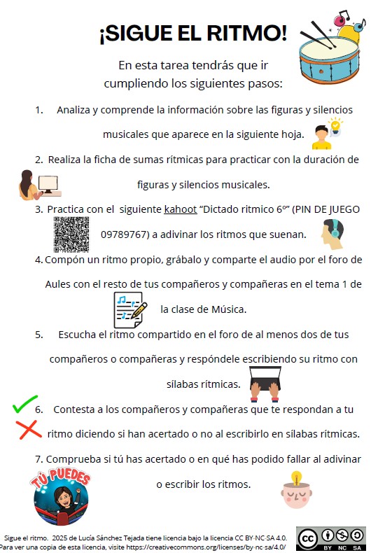 La tarea ¡Sigue el ritmo! consiste en una serie de 7 apartados con los que repasar y comprender la duración de las figuras musicales y sus silencios; practicar la suma de sus duraciones; entrenar la discriminación auditiva de un ritmo y relacionarla con su escritura musical; componer la creación de un ritmo; y finalmente escribir con sílabas rítmicas un ritmo escuchado.