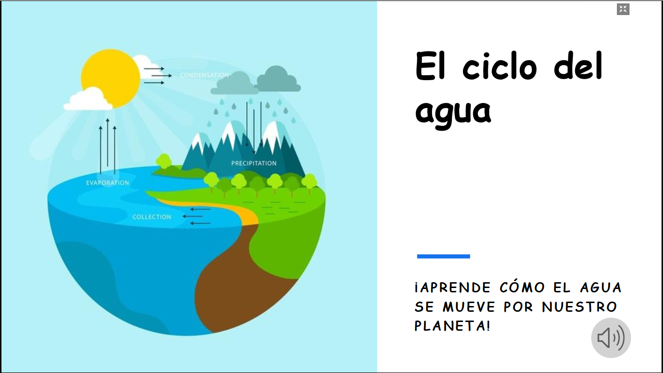 Recurso didáctico interactivo en formato presentación que explica de forma visual las etapas del ciclo del agua. Incluye ejemplos cotidianos y unas preguntas tipo test para reforzar el aprendizaje. Diseñado para alumnado de 4º de educación primaria.