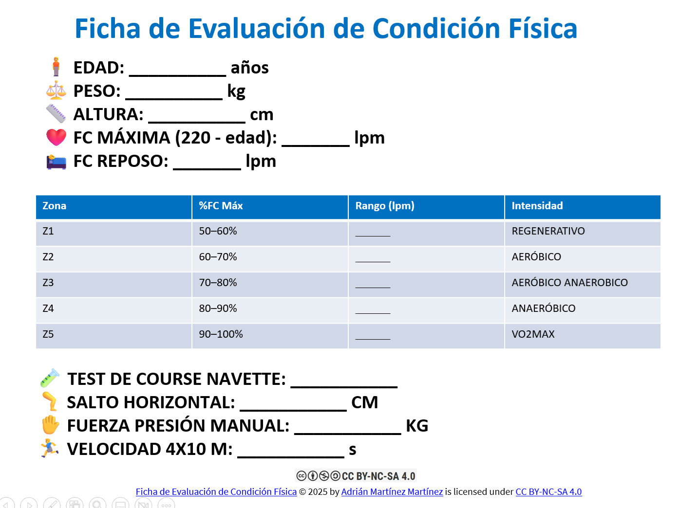 El presente recurso es una Ficha de Evaluación de la Condición Física para que el alumnado conozca su estado de condición física, la cual deberá rellenar para tener un registro de los diferentes test que evalúan la condición física, así como las distintas zonas de entrenamiento para el trabajo de la resistencia a través de la frecuencia cardíaca.