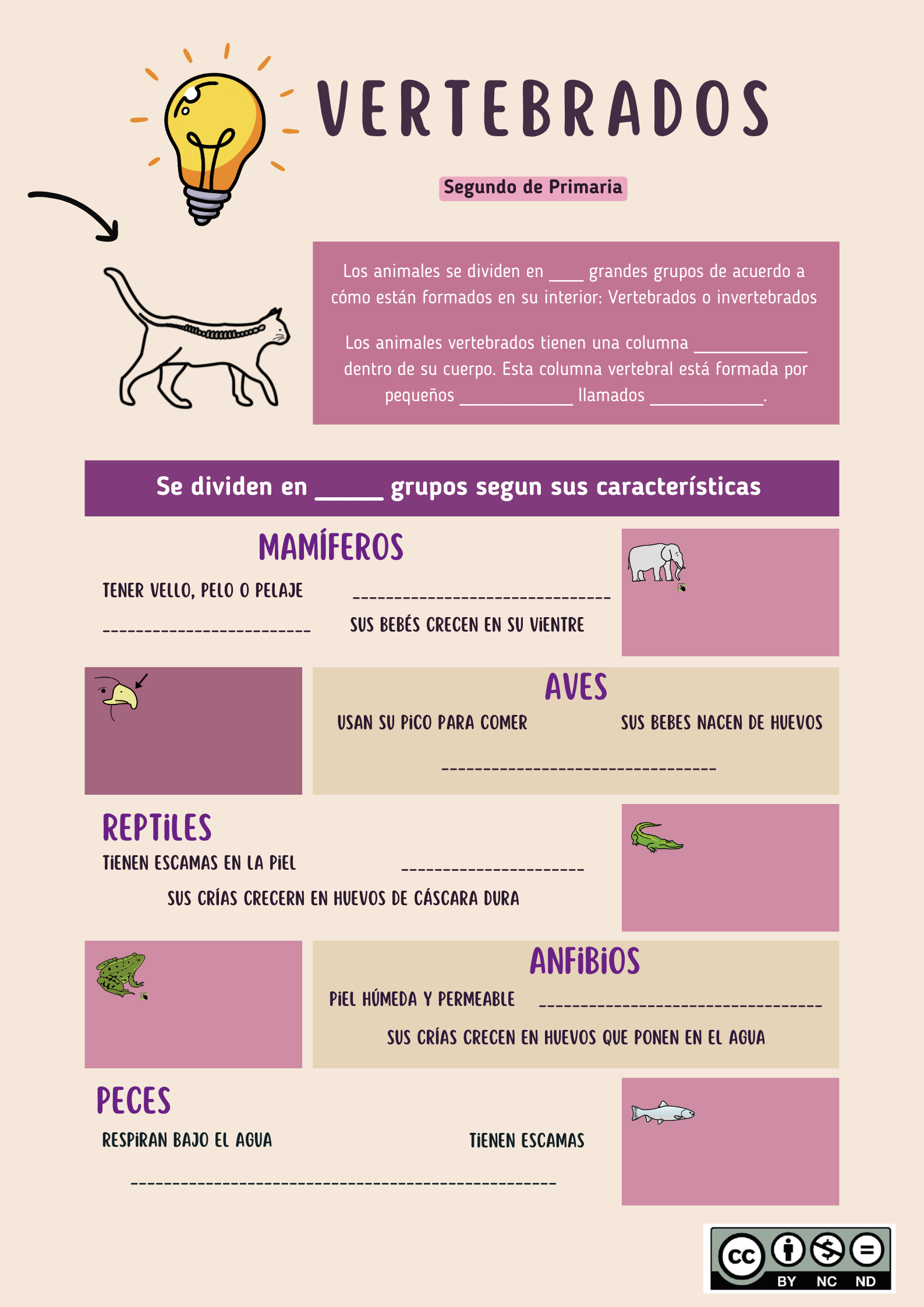 Infografía incompleta creada con PowerPoint (.pptx) a trabajar en clase sobre los cinco grupos de animales vertebrados, dirigida al alumnado de 2º de E.P.