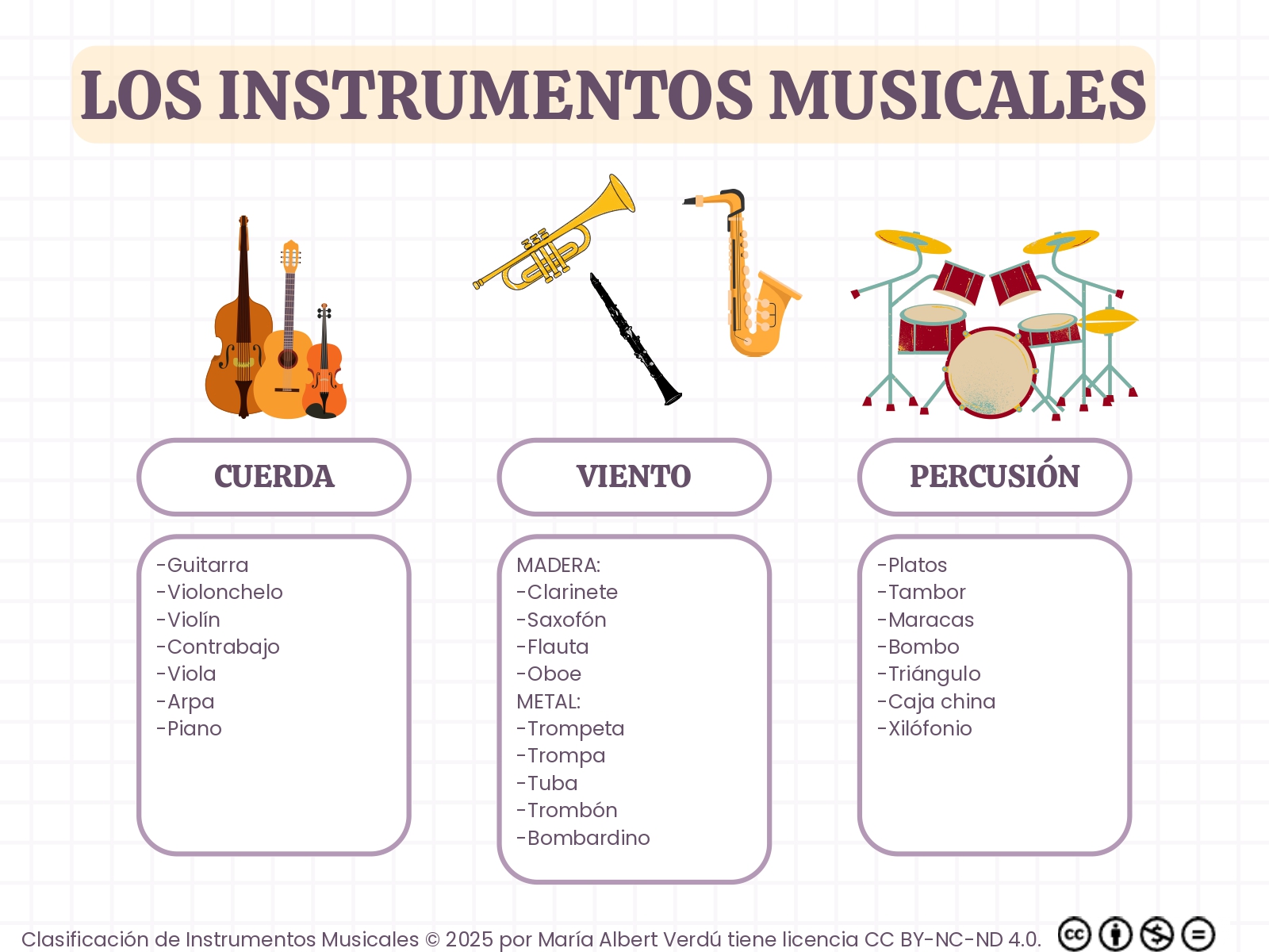 Esquema o clasificación de los diferentes instrumentos musicales para 4º de Primaria.