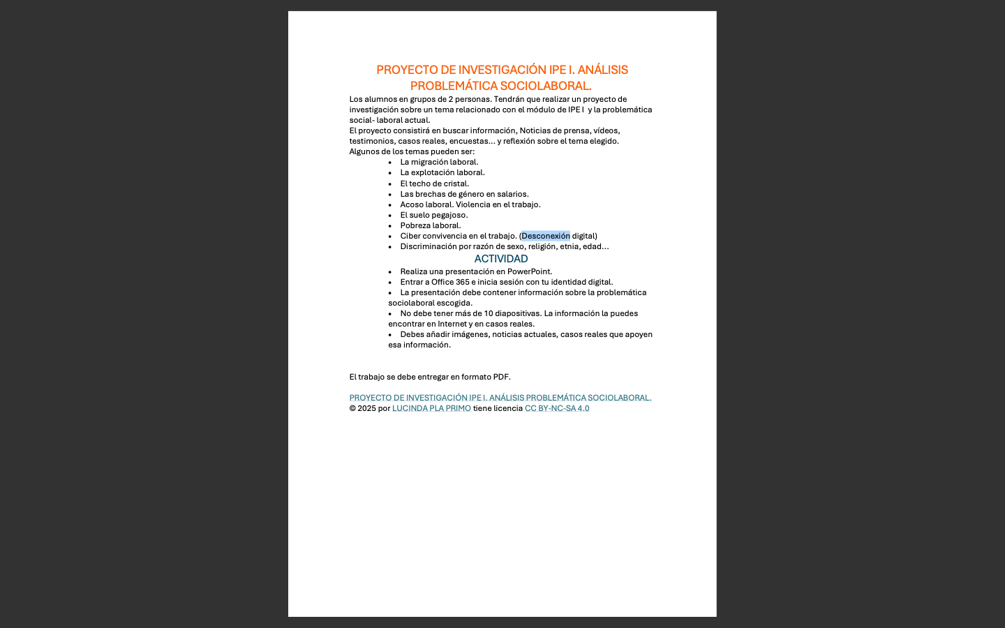 Los alumnos/as en grupos de 2 personas. Tendrán que realizar un proyecto de investigación sobre un tema relacionado con el módulo de IPE I y la problemática social- laboral actual.