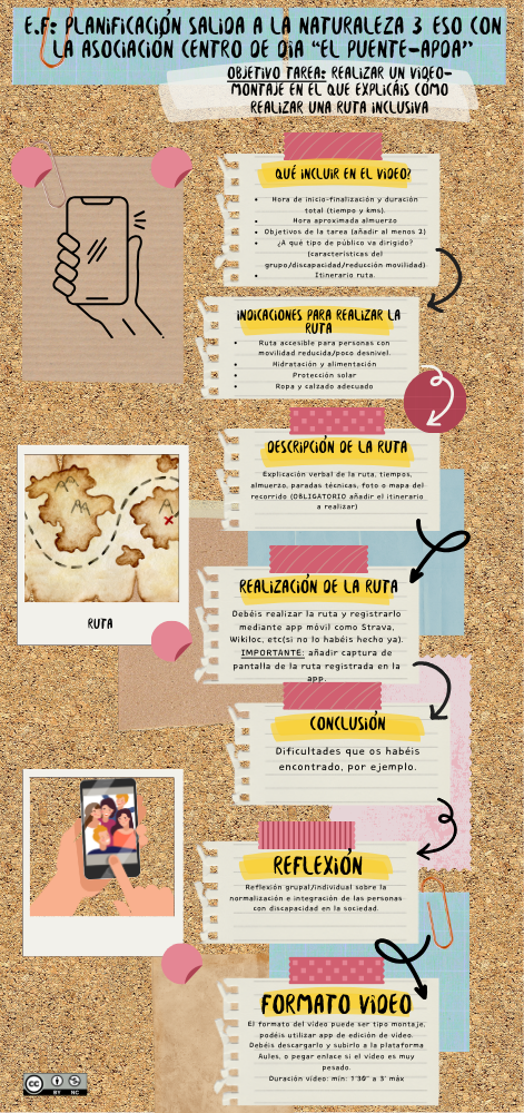 Esta tarea se basa en el dise´ño y elaboración de un vídeo-tutorial creado por el alumnado de 3º de la ESO para la asignatura de Educación física. En el mismo deben hacer una pequeña presentación del grupo de trabajo y de los objetivos de la actividad. Esta tarea se basa en el diseño de una ruta de senderismo por los alrededores de la localidad del centro teniendo en cuenta la posibilidad de que sea realizada también por personas con movilidad reducida. Deben describir el tiempo estimado de realización de la misma, el desnivel acumulado, las características de la ruta, además de otros aspectos importantes como la hidratación, alimentación y protección solar. El objetivo de la tarea es que cualquier persona, independientemente de sus características psico-físicas pueda disfrutar de una ruta de senderismo adaptada para cualquier público en compañía y disfrutar del entorno.
