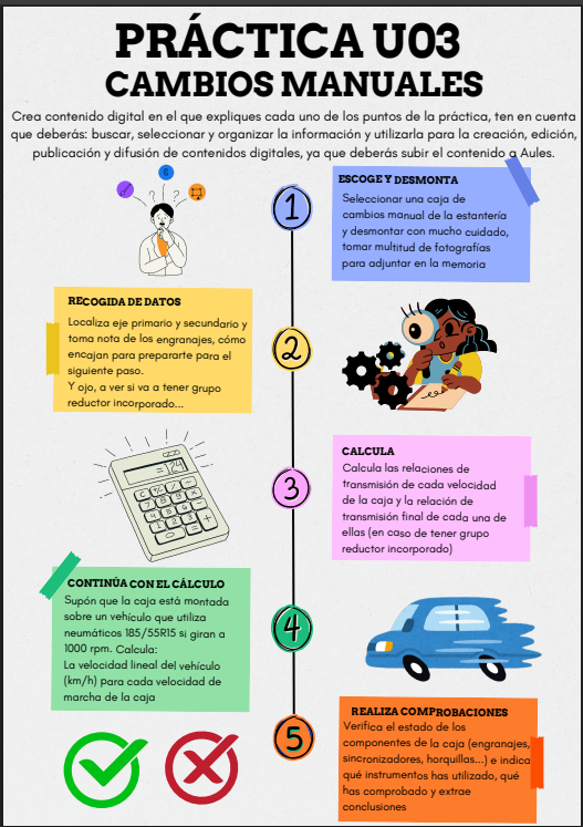 Ficha de taller para grupo de 2º Grado Medio de Electromecánica, para la asignatura de Sistemas de Transmisión y Frenado, sobre desmontaje y montaje de una caja de cambios manual, recogida de datos, comprobaciones, etc, basado en la evaluación posterior de contenido digital creado por el alumnado.