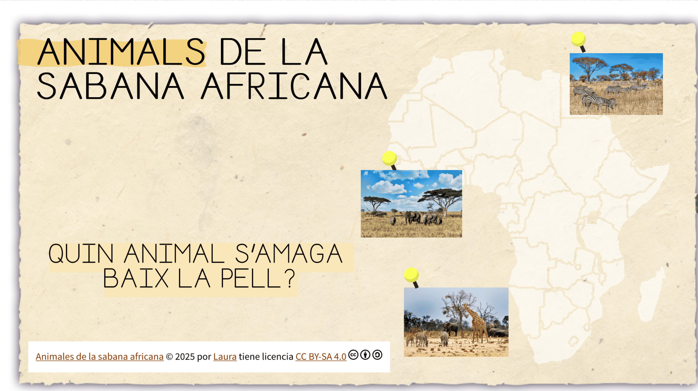 Endevina quin animal s'amaga després d'eixa pell, reconeix els animals que habiten a Àfrica, reconeix els seus noms i les lletres que el composen./ Adivina qué animal se esconde tras esa piel, reconoce los animales que habitan en África, reconoce sus nombres y las letras que lo componen.