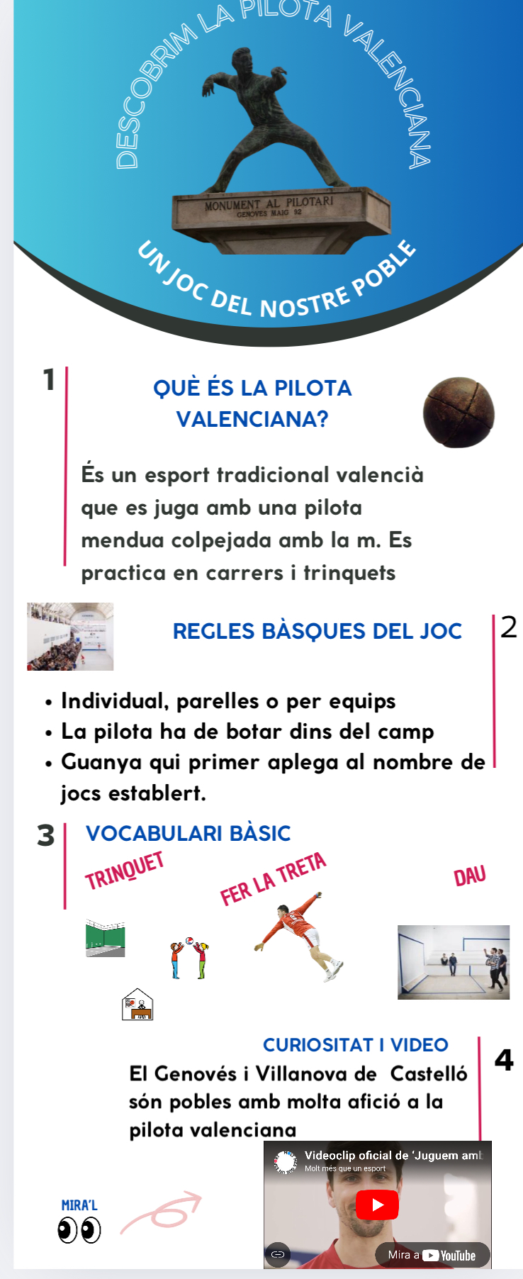 Infografia interactiva en Canva per a introduir l'alumnat de 4t de primària al món de la pilota valenciana, amb vocabulari, regles bàsiques i recursos visuals inclusius.