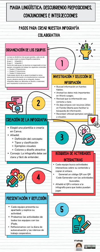 Situació d’aprenentatge: Aquesta activitat s’emmarca dins d’un projecte d’aprenentatge col·laboratiu en què l’alumnat investiga i sintetitza informació sobre les preposicions, conjuncions i interjeccions per a crear una infografia digital en equip. A més, busquen activitats interactives relacionades amb cada tema i creen codis QR o enllaços per a afegir-los a la seua infografia, facilitant així la pràctica i l’aprenentatge autònom.