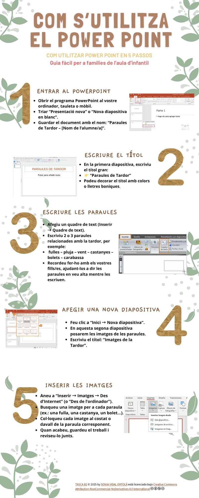 En aquesta guia es detalla com entrar al PowerPoint, escriure el títol, afegir les paraules relacionades amb la tardor, crear una nova diapositiva i inserir les imatges corresponents. L’objectiu és facilitar la realització de l’activitat a casa i fomentar la participació de les famílies en el procés d’aprenentatge dels alumnes.