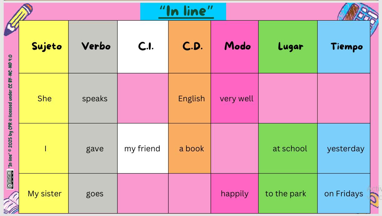 • El objetivo de esta actividad es que el alumnado reflexione sobre la diferencia de construir oraciones en español y en inglés sin necesidad de pasar por una traducción directa. Tras el visionado en Classroom (o proyección en pizarra) de esta presentación, donde podrán identificar los elementos clave en una oración en inglés, los alumnos construirán cinco oraciones de uso cotidiano (y las subirán como comentario privado en una tarea a Classroom).