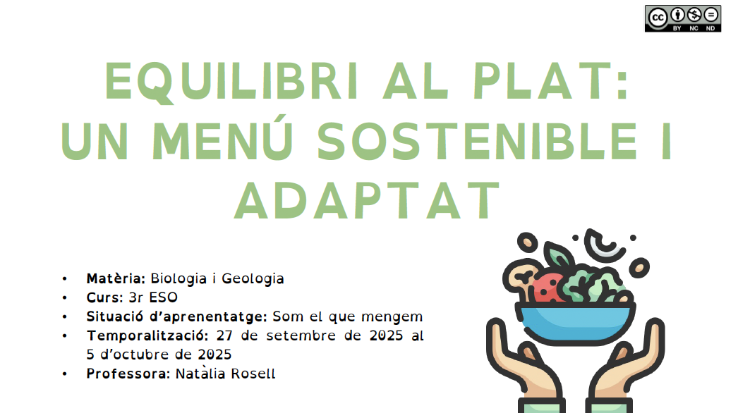 L’activitat es realitzarà com a producte final dins de la situació d’aprenentatge: Som el que mengem, que es porta a terme a la matèria de 3r ESO, després d’haver estudiat a través de pràctiques els diferents nutrients, aliments i hàbits saludables. L’alumnat, en grups, elaborarà un menú per a un personatge concret, tenint en compte: la piràmide alimentària i el plat de Harvard; prioritzant els aliments de temporada i proximitat; i la compra d’aliments amb la quantitat d’envasos més xicoteta. Cada grup rebrà un personatge a qui li elaborarà el menú amb diferents característiques: sense gluten, sense lactosa, vegetaria...
