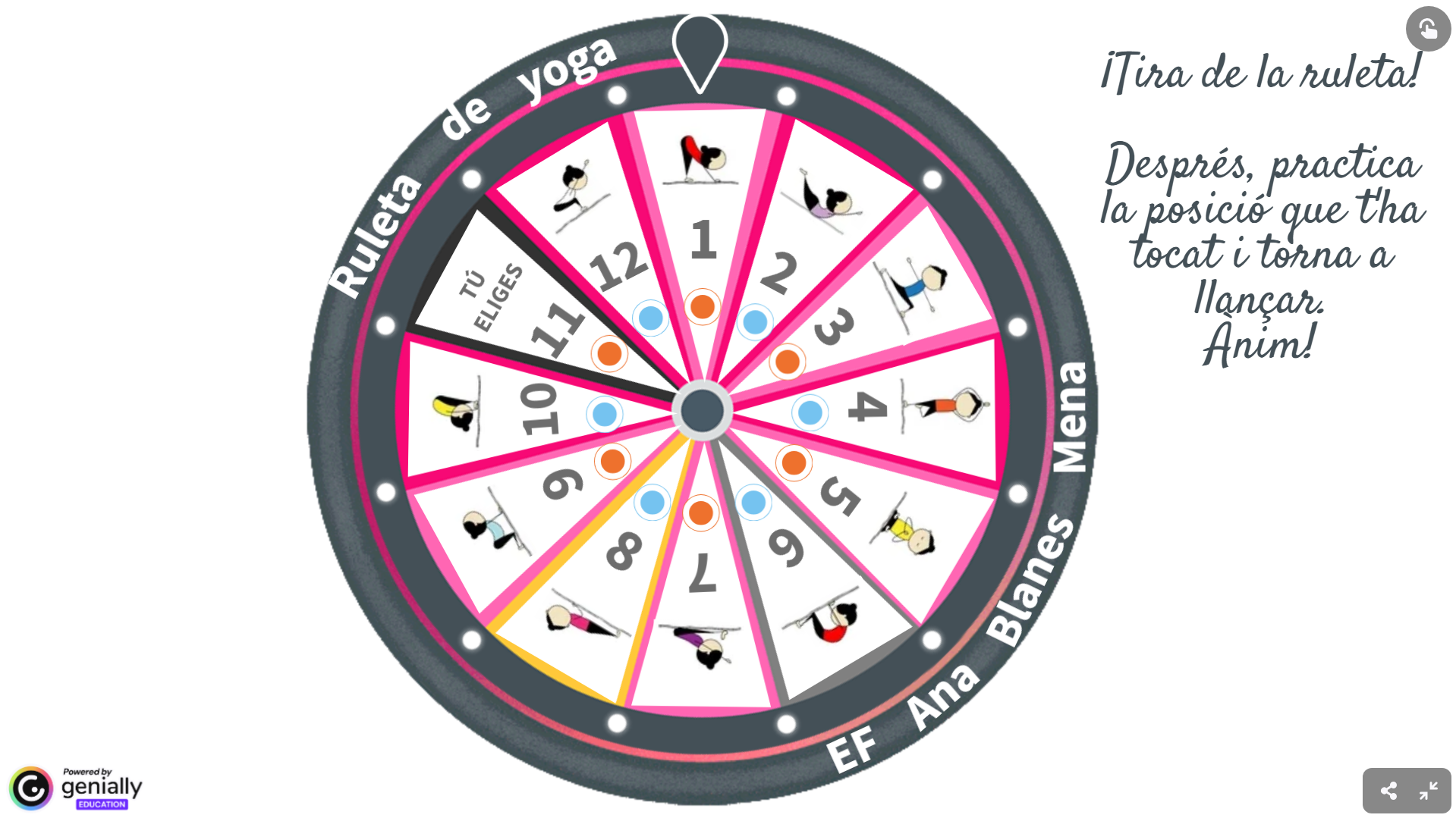“La Ruleta del Yoga” es un recurso digital interactivo creado con Genially, diseñado para fomentar el bienestar físico y emocional del alumnado de 1.º de Primaria a través de la práctica lúdica del yoga. Al hacer girar la ruleta, aparece de forma aleatoria una postura de yoga ilustrada y adaptada a la edad del alumnado. A partir de ella, los niños y niñas deben imitar la posición, manteniendo la respiración consciente y el equilibrio. El recurso puede utilizarse tanto en el aula (como parte de la rutina diaria, sesiones de Educación Física o momentos de relajación) como en casa, promoviendo la continuidad del aprendizaje y el vínculo familiar. Además, integra el uso de herramientas digitales de manera significativa y motivadora, facilitando la participación activa y la autonomía del alumnado, a la vez que refuerza competencias digitales y socioemocionales.