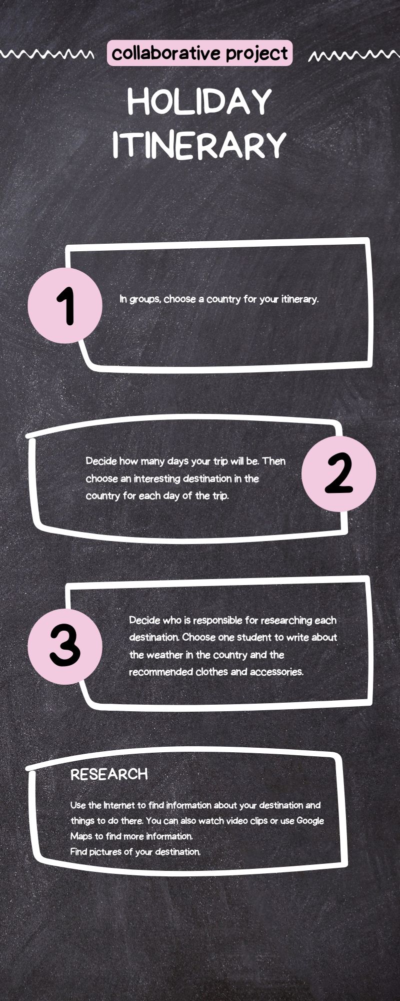 Este recurso va dirigido al alumnado de 1º ESO que cursa inglés como llengua estranjera. Se trata de una guía con instruccions donde se explica la tarea que tienen que realitzar por grupos. Primero, por grupos, tienen que elegir un destino de vacaciones y después buscaran información. Irán recopilando toda la información en un documento Word. A continuación resumirán toda la información, recopilaran imágenes o vídeos y la irán maquetando a modo infografia en un Word, Power Point o cualquier herramienta que ellos consideren adecuada dentro del entorno corporativo de Microsoft 365.