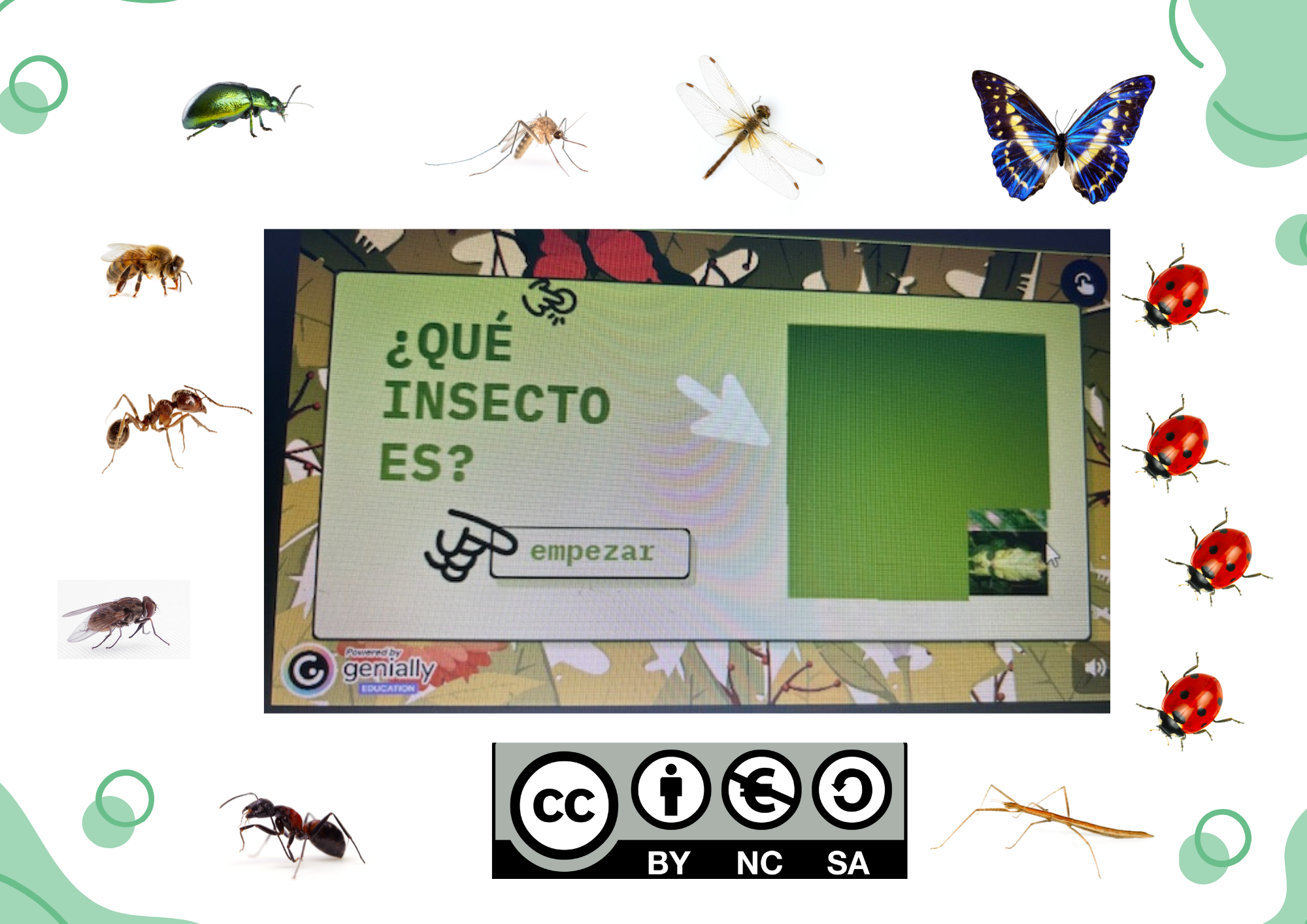 La situació d'aprenentatge (S.A) sorgeix a partir del projecte d’insectes que tot el cicle hem acordat treballar pel gran interès sorgit després de trobar i veure diferents insectes al pati com: formigues, marietes, papallones, abellerols... Dins d'aquesta situació d'aprenentatge, que tracta de conèixer els insectes que més trobem pel nostre entorn, utilitzarem diferents caixes sorpreses que serviran per a motivar al alumnat i presentar els insectes d’una mane-ra real i vivencial. Per exemple, a l’aula apareixerà un formiguer, el qual observarem i cuidarem; un terrari amb insectes pal; cucs de seda per a observar la metamorfosi i el canvi que fan (encara que no siguen insectes) entre altres. A més, hi ha una activitat concreta que és la que treballarem continguts digital i que ens ajudarà a observar i avaluar si son capaços de reconèixer els diferent insectes que els hem presen-tat durant la S.A L'activitat es titula ”¿QUÉ INSECTO ES?”. Nosaltres els xiquets i xi-quetes de la classe, hem de convertir-nos en exploradors i especialis-tes dels insectes que amb sols una ullada seran capaç d’identificar quin insecte és el que està amagat i hem de descobrir. Però, Cóm ho fa-rem? Amb l'ajuda del Genial·ly, s’ha creat un JOC VISUAL molt divertit que presenta diferents reptes als xiquets i les xiquetes els quals han de reconèixer quin insecte és el que està amagat darrere. Per des-cobrir-ho hauran d’anar passant el cursor o dit per damunt i una ve-gada sàpiguen quin es podran marcar l’opció adequada i anar a una altra pantalla.