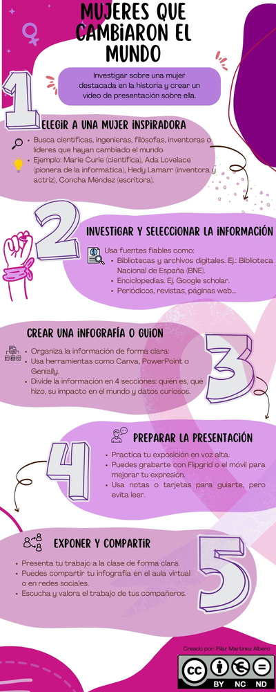 La tarea consiste en investigar y recabar información sobre mujeres destacadas en la historia, de cualquier ámbito (ciencia, arte, literatura, música…), con el fin de exponer oralmente los aspectos más relevantes de sus vidas, apoyándose en una presentación digital.