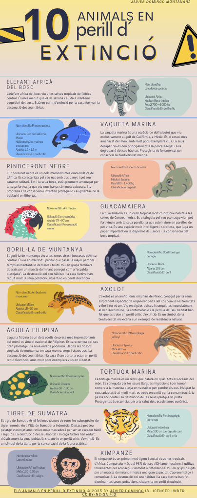 Infografia educativa per a 4t de Primària que presenta deu espècies animals en perill d’extinció amb breus descripcions, noms científics i dades sobre el seu hàbitat. Dissenyada amb criteris d’accessibilitat i inclusió, utilitzant llenguatge clar i imatges reals.