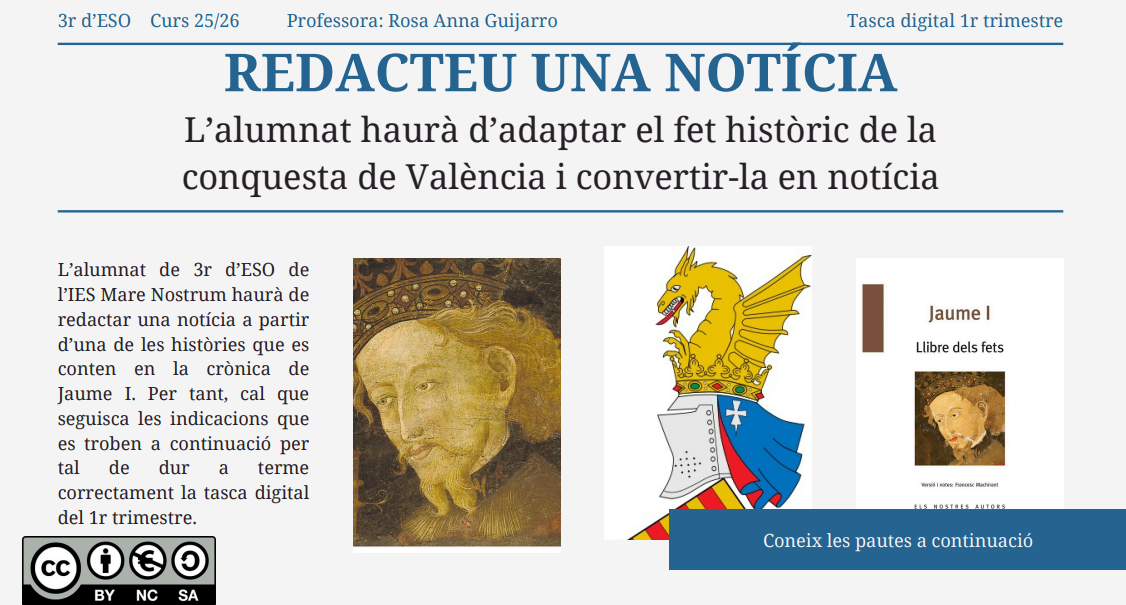 Aquest recurs serveix per a obtindre informació sobre què és una notícia (parts, característiques, recursos lingüístics) i sobre la crònica de Jaume I. També serveix per a guiar a l'alumnat a l'hora de realitzar una tasca digital concreta: la creació d'una notícia a partir de la informació sobre els esdeveniments ocorreguts el 9 d'octubre de 1238 (fets històrics els quals es conten en la crònica literària de Jaume I).