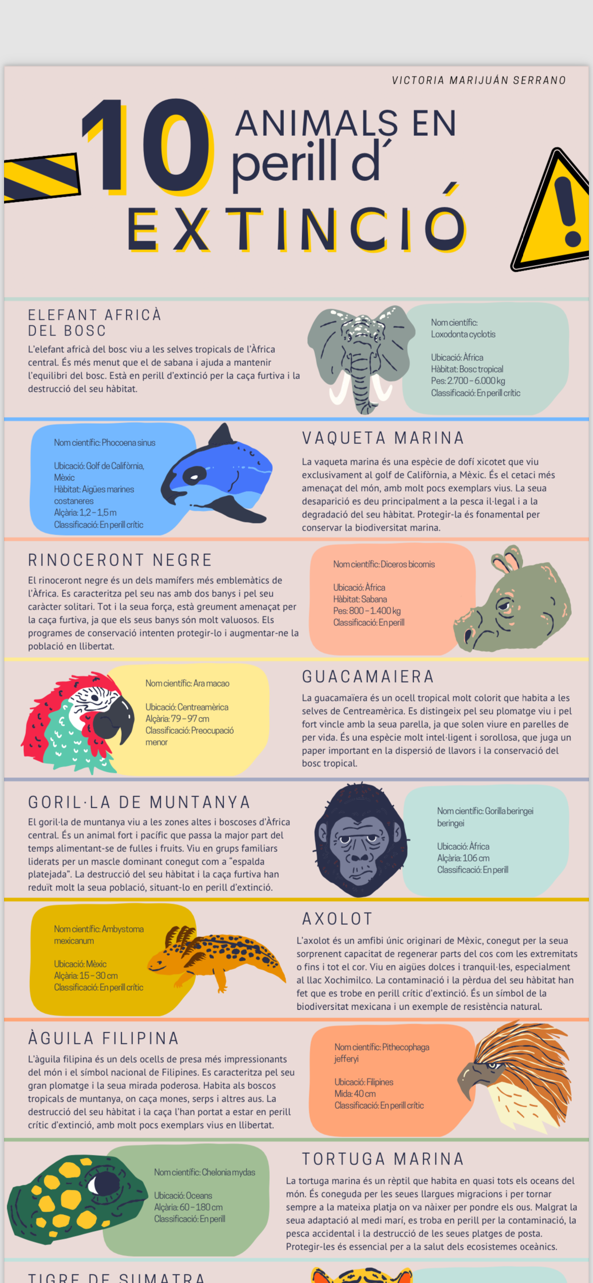Infografia educativa per a 4t de Primària que presenta deu espècies animals en perill d’extinció amb breus descripcions, noms científics i dades sobre el seu hàbitat. Dissenyada amb criteris d’accessibilitat i inclusió, utilitzant llenguatge clar i imatges reals.