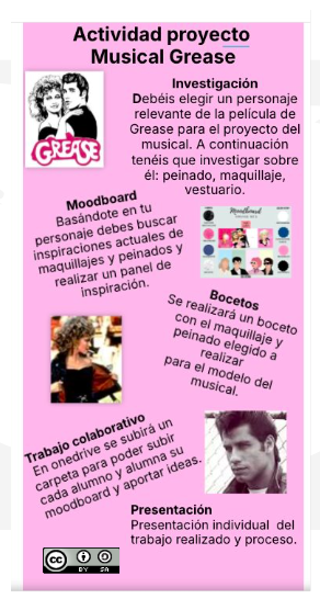 Esta infografía tiene la finalidad de que el alumnado haga una búsqueda de información on line sobre un tema:, en este caso GREASE. Deben elegir un personaje y trabajar sobre él, buscar información, maquillaje, peinado y vestuario. Una vez tengan la información, deben realizar un MOODBOARD para después hacer bocetos sobre maquillaje y peinado del personaje, que más tarde llevarán a cabo en el musical. El personaje elegido se llevará a la realidad con un modelo real.