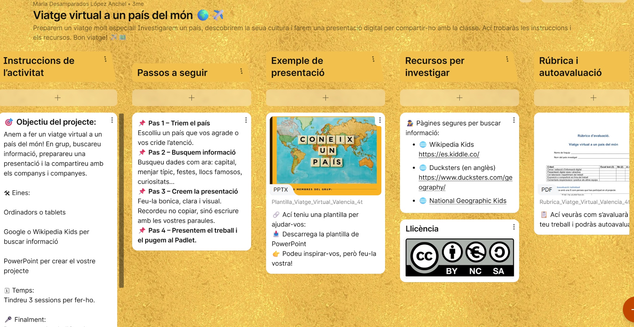 Projecte interdisciplinari digital dissenyat per a l’alumnat de 4t de Primària, dins de l’àrea de Coneixement del Medi, Valencià i Competència Digital. Consisteix en l’elaboració d’una presentació i un Padlet sobre un país. Fomenta la creativitat, la cerca d’informació i l’expressió oral, integrant recursos per a la inclusió.
