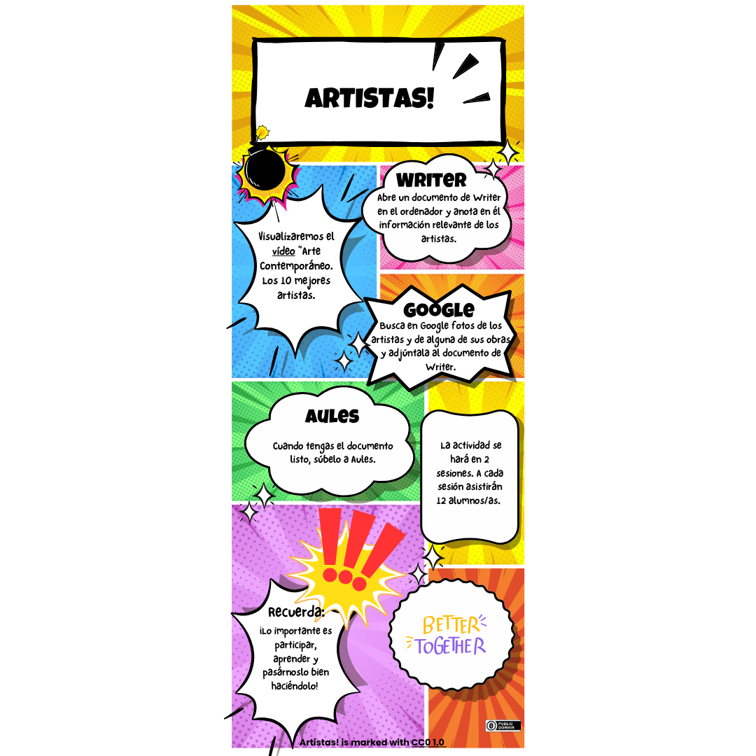 • En el Aula de Informática visualizaremos el vídeo “Arte contemporáneo. Los 10 mejores artistas”. Los alumnos/as abrirán un documento de Writer y en él apuntarán la información principal de cada artista como nacionalidad, estilo, obras más famosas o fecha de nacimiento. Además tendrán que buscar en Google alguna imagen de estos y de alguna de sus obras más características, y adjuntarla al archivo de Writer. Cuando tengan el documento completo lo subirán a Aules.