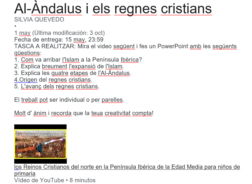En aquesta activitat, l'alumnat haurà de visualitzar un vídeo educatiu de YouTube sobre Al-Àndalus i els regnes cristians de la Península Ibèrica durant l'Edat Mitjana. A partir del contingut del vídeo, elaboraran una presentació en PowerPoint responent cinc qüestions claus sobre l’arribada de l’Islam, l’expansió islàmica, les etapes d’Al-Àndalus, l’origen dels regnes cristians i el seu avanç territorial. El treball es pot fer de manera individual o en parelles, fomentant la creativitat i la comprensió del període històric tractat.