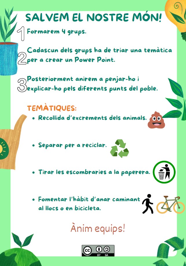 Per grups, crearem un power point que penjarem pel nostre poble per a recordar i informar a les persones que cuidar el medi ambient és cosa de tots i totes. Prèviament, parlarem amb el personal de l’Ajuntament per a veure quins són els aspectes més importants. Cal conscienciar a les persones en que: cal recollir els excrements dels gossos, cal recollir la basura, fomentar l’us del transport sostenible o anar caminant als llocs…